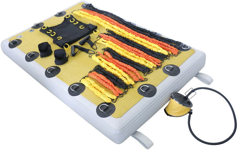 说明:专业不稳定训练平台,底部充气灌水用于稳定,平面有14个拉环,配三种不同阻力训练绳各8根,配有专业脚踝,手腕绑带,以及弹力训练服一件,可用于身体全方位的训练。