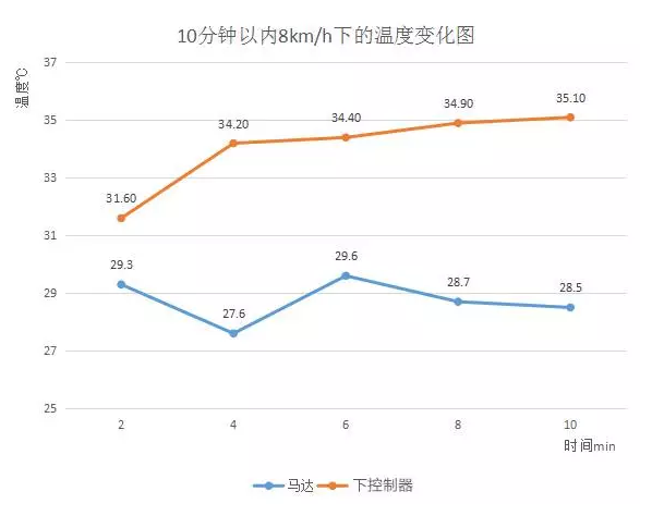 最后我们来看温度, 温度的变化可以直接看出马达质量的好坏,马达和下控制器的温度变化会影响马达的工作寿命。于是,小编就让同事(60kg)以8km/h的速度,持续跑了10分钟,测试马达和下控制器的温度变化,具体情况请看下图: